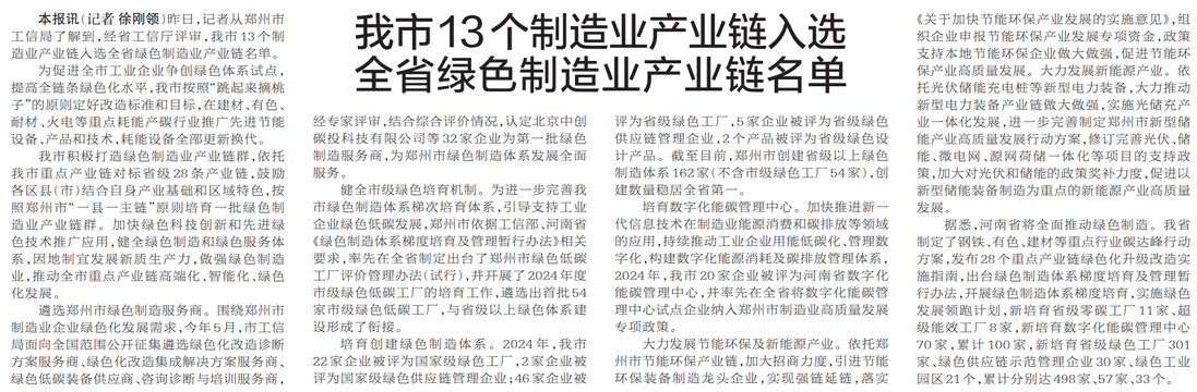 昨日,记者从郑州市工信局了解到,经省工信厅评审,我市13个制造业产业链入选全省绿色制造业产业链名单。(今日《郑州日报》2版)