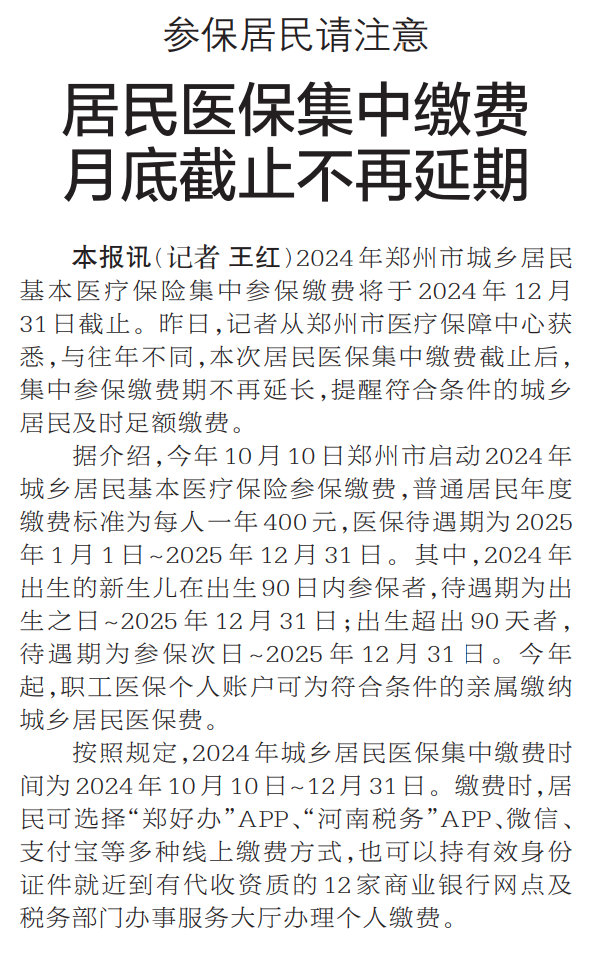 2024年郑州市城乡居民基本医疗保险集中参保缴费将于2024年12月31日截止。昨日,记者从郑州市医疗保障中心获悉,与往年不同,本次居民医保集中缴费截止后,集中参保缴费期不再延长,提醒符合条件的城乡居民及时足额缴费。(今日《郑州日报》2版)