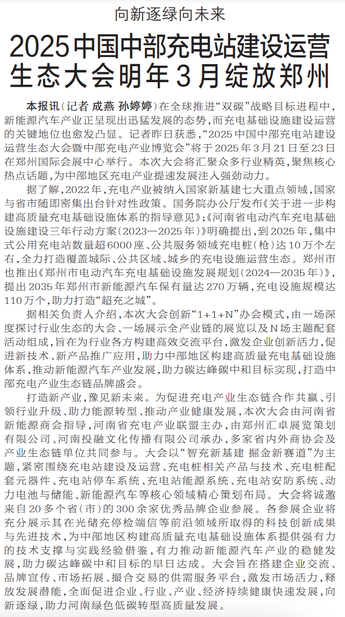 在全球推进“双碳”战略目标进程中,新能源汽车产业正呈现出迅猛发展的态势,而充电基础设施建设运营的关键地位也愈发凸显。记者昨日获悉,“2025中国中部充电站建设运营生态大会暨中部充电产业博览会”将于2025年3月21日至23日在郑州国际会展中心举行。本次大会将汇聚众多行业精英,聚焦核心热点话题,为中部地区充电产业提速发展注入强劲动力。(今日《郑州日报》5版)