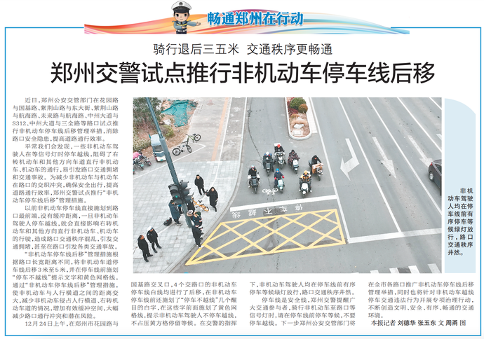 近日,郑州公安交管部门在花园路与国基路、紫荆山路与东大街、紫荆山路与航海路、未来路与航海路、中州大道与S312、中州大道与三全路等路口试点推行非机动车停车线后移管理举措,消除路口安全隐患,提高道路通行效率。(今日《郑州日报》5版)