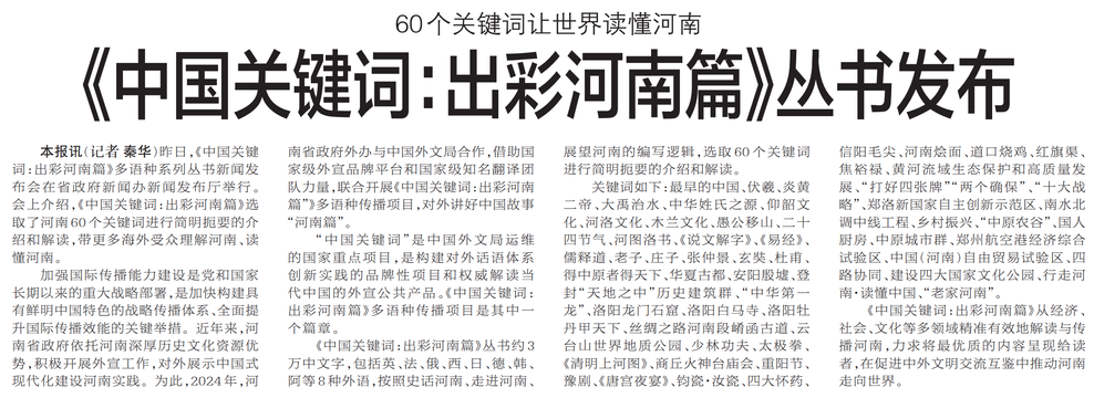 昨日,《中国关键词:出彩河南篇》多语种系列丛书新闻发布会在省政府新闻办新闻发布厅举行。会上介绍,《中国关键词:出彩河南篇》选取了河南60个关键词进行简明扼要的介绍和解读,带更多海外受众理解河南、读懂河南。(今日《郑州日报》8版)