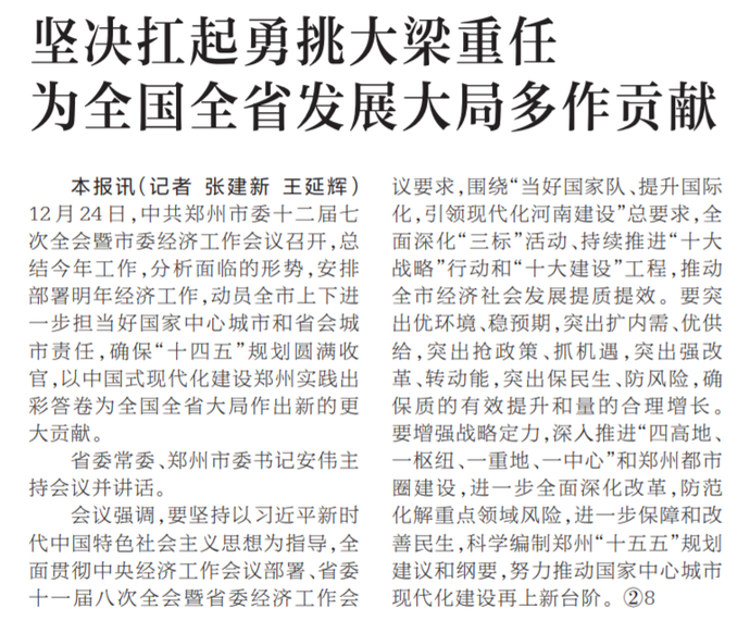 12月24日,中国共产党郑州市第十二届委员会第七次全体会议暨市委经济工作会议召开。