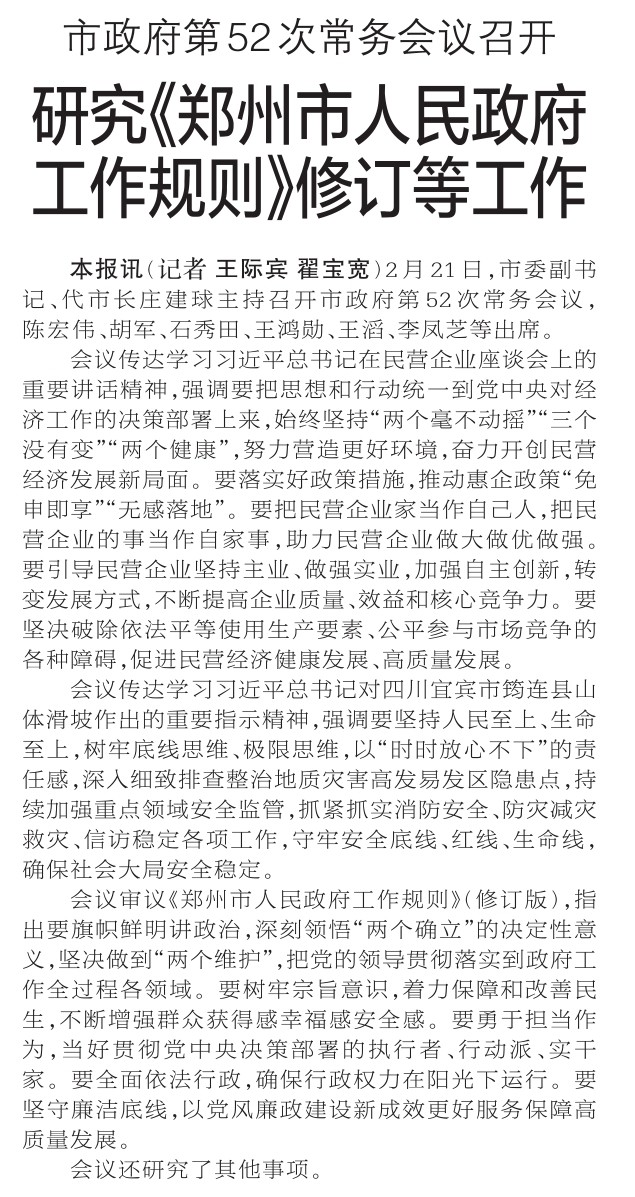2月21日,市委副书记、代市长庄建球主持召开市政府第52次常务会议,陈宏伟、胡军、石秀田、王鸿勋、王滔、李凤芝等出席。(今日《郑州日报》1版)