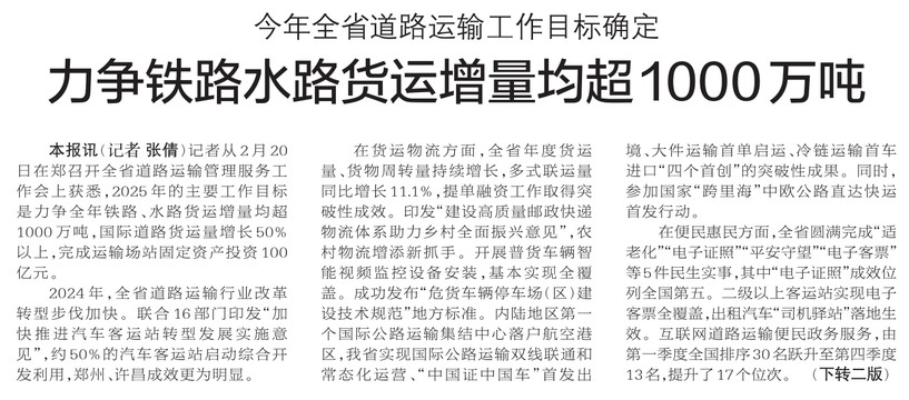 记者从2月20日在郑召开全省道路运输管理服务工作会上获悉,2025年的主要工作目标是力争全年铁路、水路货运增量均超1000万吨,国际道路货运量增长50%以上,完成运输场站固定资产投资100亿元。(今日《郑州日报》1版、2版)