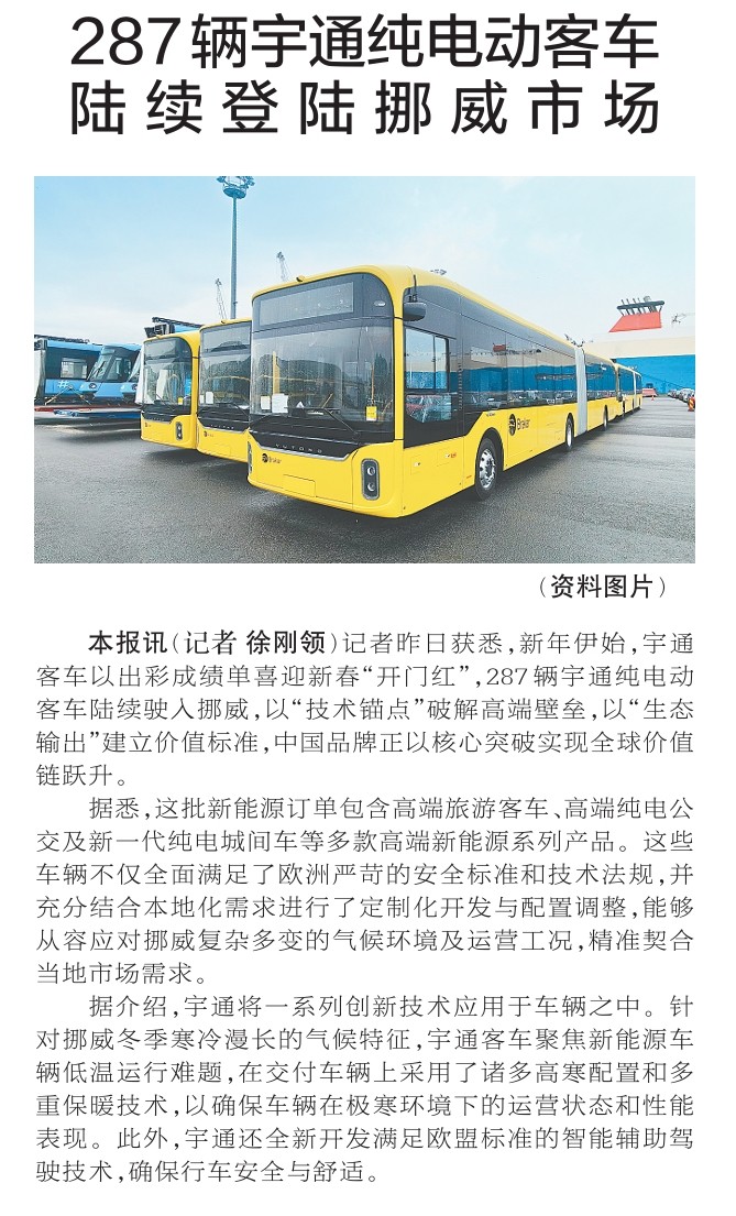 记者昨日获悉,新年伊始,宇通客车以出彩成绩单喜迎新春“开门红”,287辆宇通纯电动客车陆续驶入挪威,以“技术锚点”破解高端壁垒,以“生态输出”建立价值标准,中国品牌正以核心突破实现全球价值链跃升。(今日《郑州日报》1版)