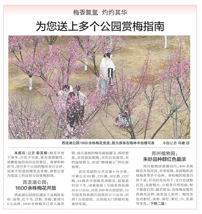 梅花孕育于寒冬,开花于早春,素有凌霜傲雪、清雅俊逸的高洁品质象征。春寒料峭时节,郑州多个公园的梅花花开正好,如果不知道到哪里去赏梅,请看记者为您送上的这份公园赏梅指南。(今日《郑州日报》1版)