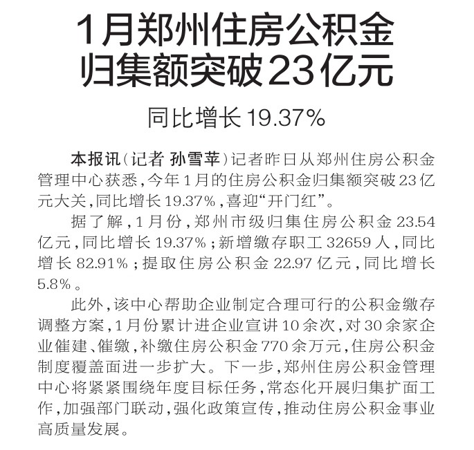记者昨日从郑州住房公积金管理中心获悉,今年1月的住房公积金归集额突破23亿元大关,同比增长19.37%,喜迎“开门红”。(今日《郑州日报》1版)