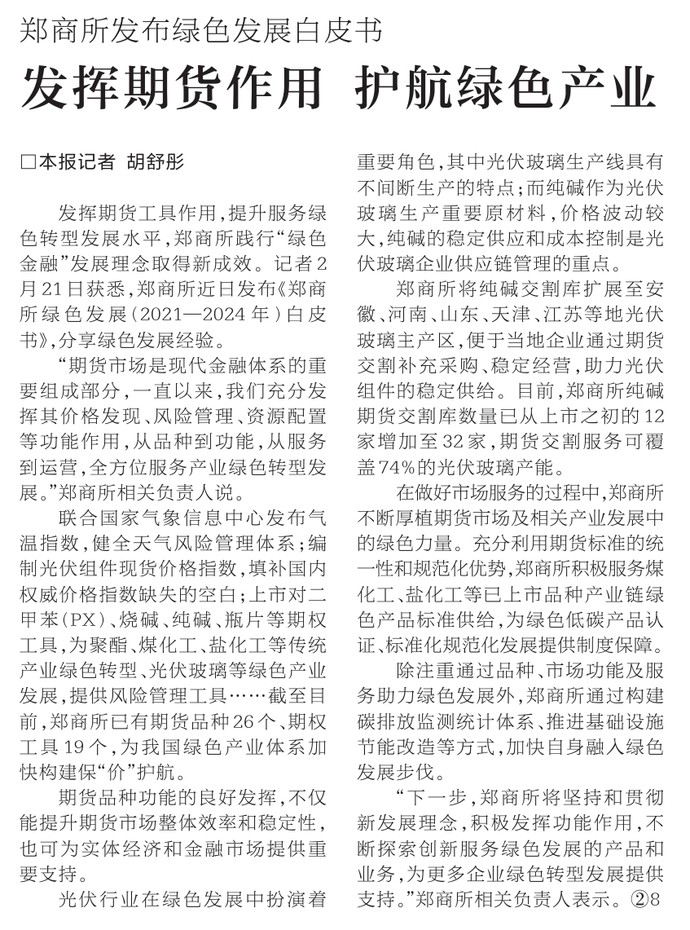 发挥期货工具作用,提升服务绿色转型发展水平,郑商所践行“绿色金融”发展理念取得新成效。记者2月21日获悉,郑商所近日发布《郑商所绿色发展(2021—2024年)白皮书》,分享绿色发展经验。(今日《河南日报》2版)