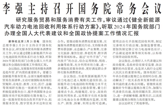 国务院总理李强2月21日主持召开国务院常务会议,研究服务贸易和服务消费有关工作,审议通过《健全新能源汽车动力电池回收利用体系行动方案》,听取2024年国务院部门办理全国人大代表建议和全国政协提案工作情况汇报。(今日《人民日报》1版)