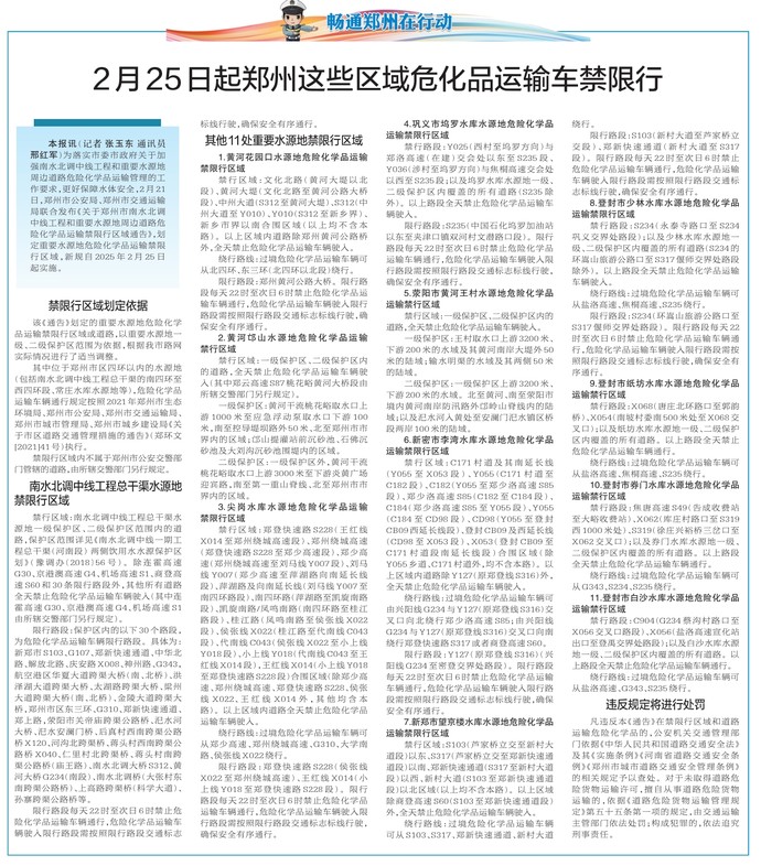 为落实市委市政府关于加强南水北调中线工程和重要水源地周边道路危险化学品运输管理的工作要求,更好保障水体安全,2月21日,郑州市公安局、郑州市交通运输局联合发布《关于郑州市南水北调中线工程和重要水源地周边道路危险化学品运输禁限行区域通告》,划定重要水源地危险化学品运输禁限行区域,新规自2025年2月25日起实施。(今日《郑州日报》2版)
