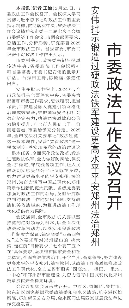 2月21日,市委政法工作会议召开。会议深入学习贯彻习近平总书记对政法工作的重要指示精神,贯彻落实中央、省委政法工作会议精神和市委十二届七次全会暨市委经济工作会议、市两会部署要求,总结工作,分析形势,研究部署2025年全市政法工作。省委常委、市委书记安伟对政法工作作出批示。(今日《郑州日报》1版)