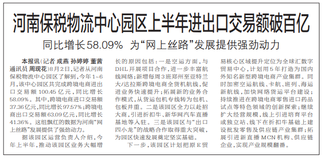 河南保税物流中心园区上半年进出口交易额破百亿