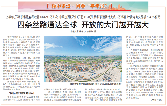 上半年,郑州机场旅客吞吐量1376.99万人次、中欧班列(郑州)开行1128列、海铁联运累计完成3万标箱、跨境电商交易额734.35亿元