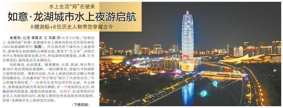 8月2日晚,“如意向上 龙湖向新”如意·龙湖城市水上夜游启航仪式在郑东新区CBD如意湖畔举行(如图)。作为郑州首个城市水上夜游项目,游客将从如意湖码头乘船出发,置身于“大玉米”、河南艺术中心等地标建筑包围之中,各色演绎轮番登场,水幕、灯光交替变幻,最终抵达北龙湖码头。(今日《郑州日报》1版、4版)