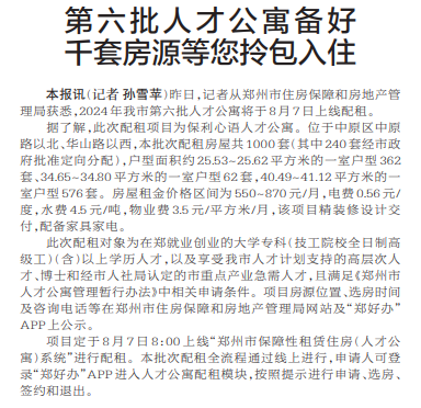 昨日,记者从郑州市住房保障和房地产管理局获悉,2024年我市第六批人才公寓将于8月7日上线配租。(今日《郑州日报》1版)