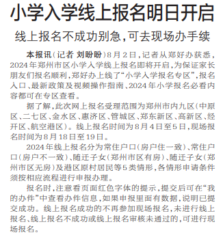 8月2日,记者从郑好办获悉,2024年郑州市区小学入学线上报名即将开启,为保证家长朋友们报名顺利,郑好办上线了“小学入学报名专区”,报名入口、最新政策及视频操作指南、2024年小学报名必看内容都可在专区查看。(今日《郑州日报》2版)