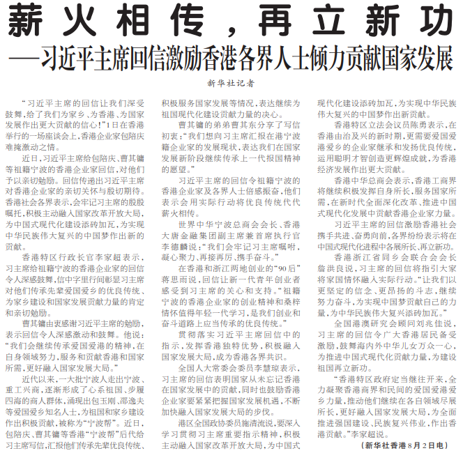 “习近平主席的回信让我们深受鼓舞,给了我们为家乡、为香港、为国家发展作出更大贡献的信心!”1日在香港举行的一场座谈会上,香港企业家包陪庆难掩激动之情。(今日《人民日报》1版)