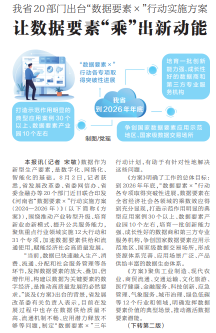 数据作为新型生产要素,是数字化、网络化、智能化的基础。8月2日,记者获悉,省发展改革委、省委网信办、省委金融办等20个部门近日联合印发《河南省“数据要素×”行动实施方案(2024—2026年)》(以下简称《方案》),围绕推动产业转型升级、培育新业态新模式、提升公共服务能力,聚焦重点行业领域实施12大行动和31个专项,加速数据要素供给和流通使用,赋能经济社会高质量发展。(今日《河南日报》1版、2版)