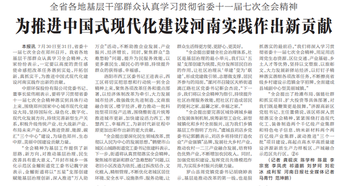 7月30日至31日,省委十一届七次全会在郑州召开。我省各地基层干部群众认真学习全会精神,大家纷纷表示,一定要以高度的责任感使命感把改革任务落到实处,开拓创新、真抓实干,为推进中国式现代化建设河南实践作出新的贡献。(今日《河南日报》2版)