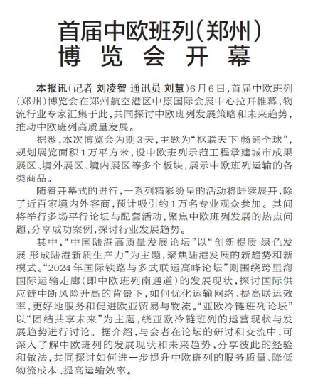 6月6日,首届中欧班列(郑州)博览会在郑州航空港区中原国际会展中心拉开帷幕,物流行业专家汇集于此,共同探讨中欧班列发展策略和未来趋势,推动中欧班列高质量发展。(今日《郑州日报》1版)