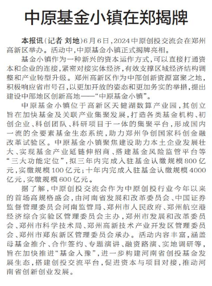 6月6日,2024中原创投交流会在郑州高新区举办。活动中,中原基金小镇正式揭牌亮相。(今日《郑州日报》1版)