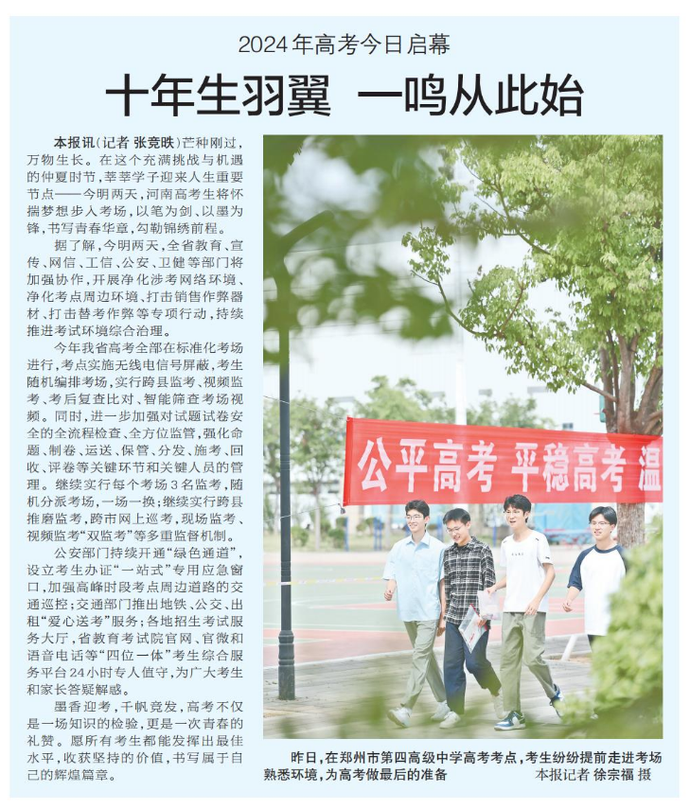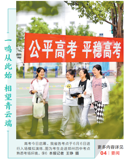 芒种刚过,万物生长。在这个充满挑战与机遇的仲夏时节,莘莘学子迎来人生重要节点——今明两天,河南高考生将怀揣梦想步入考场,以笔为剑、以墨为锋,书写青春华章,勾勒锦绣前程。(今日《郑州日报》1版)