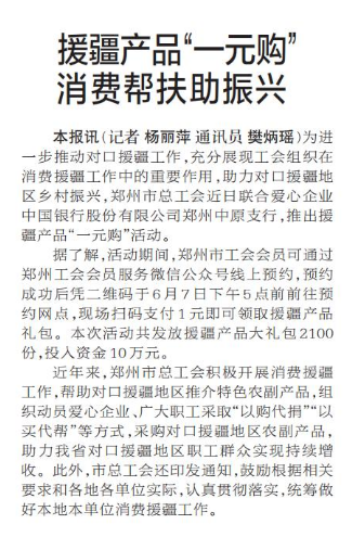 为进一步推动对口援疆工作,充分展现工会组织在消费援疆工作中的重要作用,助力对口援疆地区乡村振兴,郑州市总工会近日联合爱心企业中国银行股份有限公司郑州中原支行,推出援疆产品“一元购”活动。(今日《郑州日报》2版)