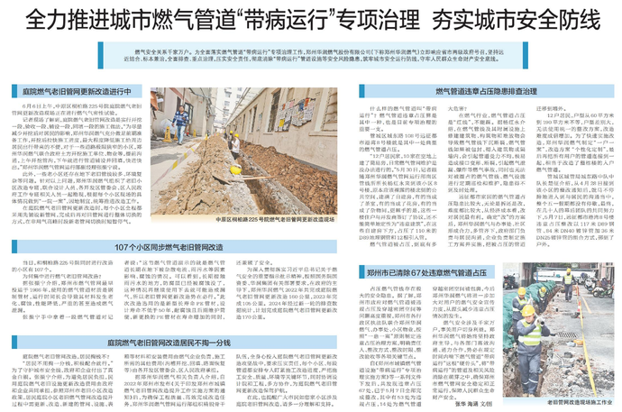 燃气安全关系千家万户。为全面落实燃气管道“带病运行”专项治理工作,郑州华润燃气股份有限公司立即响应省市两级政府号召,坚持远近结合、标本兼治,全面排查、重点治理,压实安全责任,彻底消除“带病运行”管道设施等安全风险隐患,筑牢城市安全运行防线,守牢人民群众生命财产安全底线。(今日《郑州日报》2版)