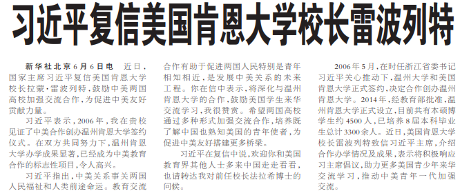 近日,国家主席习近平复信美国肯恩大学校长拉蒙·雷波列特,鼓励中美两国高校加强交流合作,为促进中美友好贡献力量。(今日《人民日报》1版)