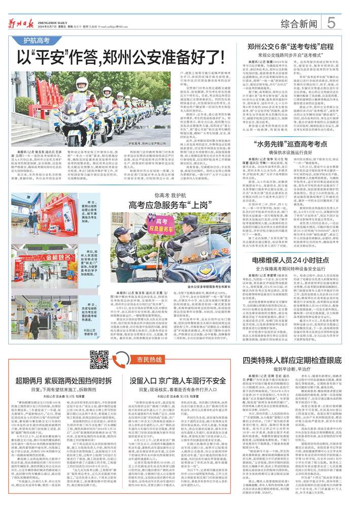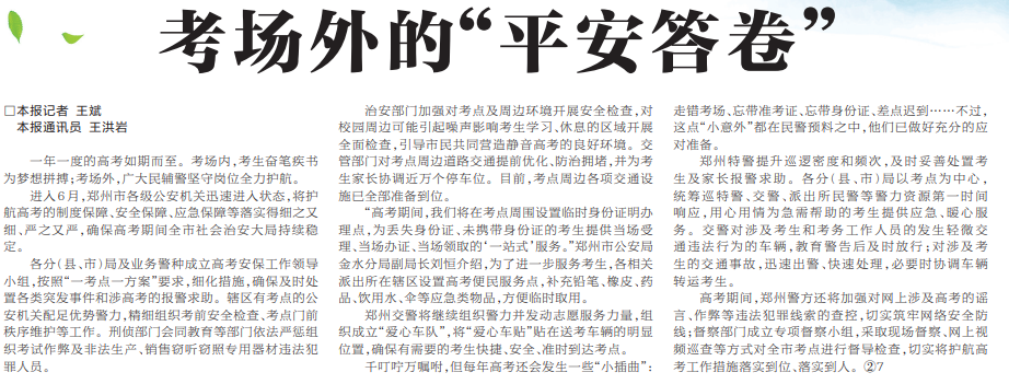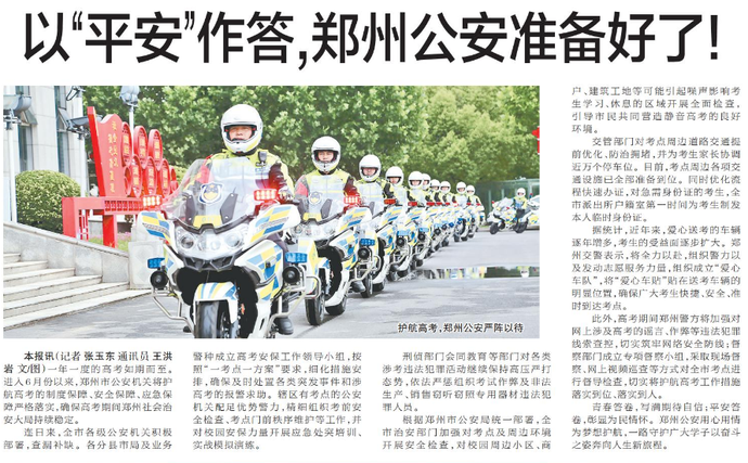 一年一度的高考如期而至。进入6月份以来,郑州市公安机关将护航高考的制度保障、安全保障、应急保障严格落实,确保高考期间郑州社会治安大局持续稳定。(今日《郑州日报》5版)
