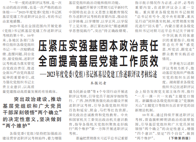 2023年是在全国范围内开展党委(党组)书记抓基层党建工作述职评议考核的第十年。10年来,各地区各部门各单位组织各级党组织书记一年一次晾晒成绩、查摆问题,同台竞技、接受检阅,述职评议考核成为落实管党治党政治责任、推进全面从严治党向基层延伸的重要牵引,成为强化党组织书记主责主业意识、以高质量党建推动高质量发展的有效载体。(今日《人民日报》1版、4版)