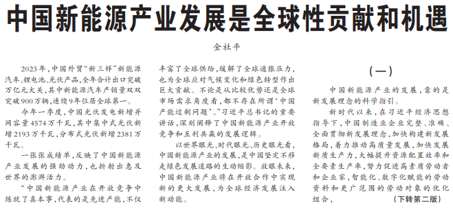 一张张成绩单,反映了中国新能源产业发展的强劲动力,也折射出惠及世界的澎湃活力。(今日《人民日报》1版、2版)
