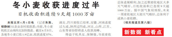 从农业农村部获悉:当前,冬小麦机收正由南向北加快推进。截至6月5日,各地冬小麦已收1.9亿亩,收获进度57%。湖北、四川麦收已结束,安徽、河南进度过九成,陕西过四成,河北、山西、江苏、山东等省份即将进入收获高峰。(今日《人民日报》1版、8版)