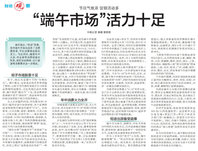 端午临近,“热浪”来袭,我市端午市场也迎来了消费最热季,节日消费释放新的活力。与此同时,随着年中大促、毕业季等消费旺季的到来,居民休闲购物、出行旅游等消费需求进一步释放。(今日《郑州日报》6版)