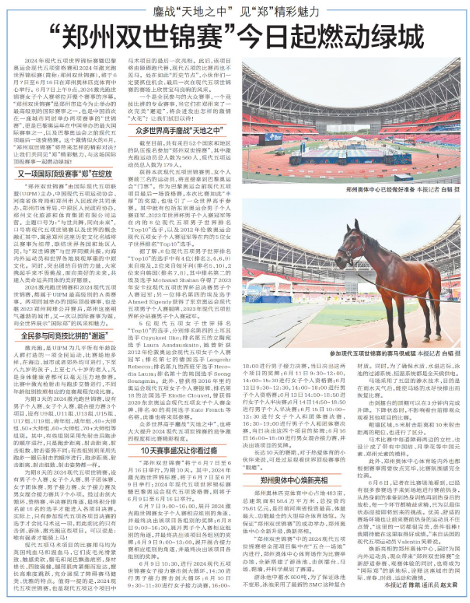 2024年现代五项世界锦标赛暨巴黎奥运会现代五项资格赛和2024年激光跑世界锦标赛(简称:郑州双世锦赛),将于6月7日至6月16日在郑州奥林匹克体育中心举行。6月7日上午9点,2024激光跑世锦赛女子个人赛将拉开整个赛事的序幕。“郑州双世锦赛”是郑州市迄今为止举办的最高级别的国际赛事之一,也是中国首次在一座城市同时举办两项赛事的“世锦赛”,更是巴黎奥运年在中国举办的最大国际赛事之一,以及巴黎奥运会之前现代五项最后一场资格赛。这个激情似火的6月,“郑州双世锦赛”将带来怎样的精彩对决?让我们共同见“郑”精彩魅力,与这场国际顶级赛事一起燃动绿城!(今日《郑州日报》8版)