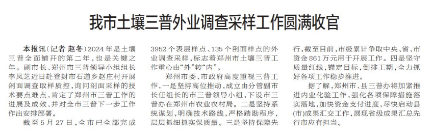 2024年是土壤三普全面铺开的第二年,也是关键之年。副市长、郑州市三普领导小组组长李凤芝近日赴登封市石道乡赵庄村开展剖面调查取样质控,询问剖面采样的技术要点难点,肯定了郑州市三普工作的进展及成效,并对全市三普下一步工作作出安排部署。(今日《郑州日报》2版)