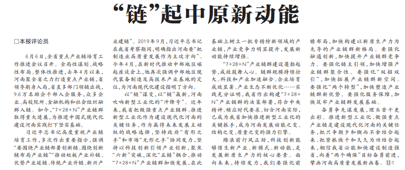 6月6日,全省重点产业链培育工作推进会议召开。全局性谋划、战略性布局、整体性推进,去年4月以来,河南聚全省之力打造重点产业链,省领导躬身入局,省直多部门领链出战,9.6万名助企干部入企服务,众多企业、高校院所、金融机构和社会组织融群入链。如今,“7+28+N”产业链群取得重大进展,为推进中国式现代化建设河南实践打下坚实基础。(今日《河南日报》1版)