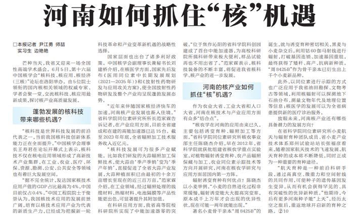 芒种当天,我省又迎来一场全国性高端学术盛会。6月5日,第十六届中国核学会“核科技、核应用、核经济(三核)”论坛在洛阳举办。由5位院士领衔的国内核相关领域的权威专家、学者会聚一堂,交流核科技、核应用最新成果,探讨核产业高质量发展。(今日《河南日报》2版)