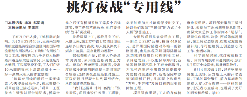 千家万户已入梦,工地机器正轰鸣。6月3日23时45分,记者来到郑州航空港经济综合实验区河南国际物流枢纽专用铁路项目工地,深夜探访八千乡特大桥跨雍州路连续梁建设情况,只见现场灯火通明,工程车穿梭不停,工人们在近10米高的梁体上浇筑混凝土……好一派热火朝天的作业景象!(今日《河南日报》2版)