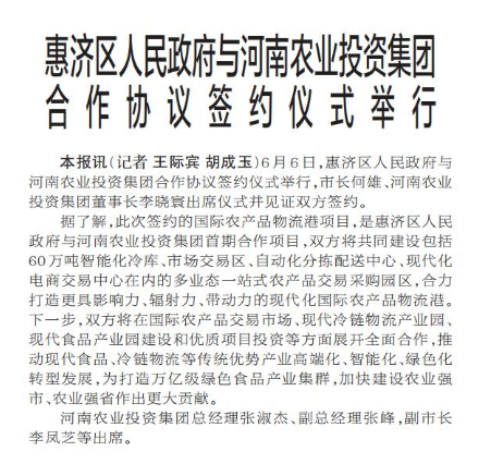 6月6日,惠济区人民政府与河南农业投资集团合作协议签约仪式举行,市长何雄、河南农业投资集团董事长李晓寰出席仪式并见证双方签约。(今日《郑州日报》1版)