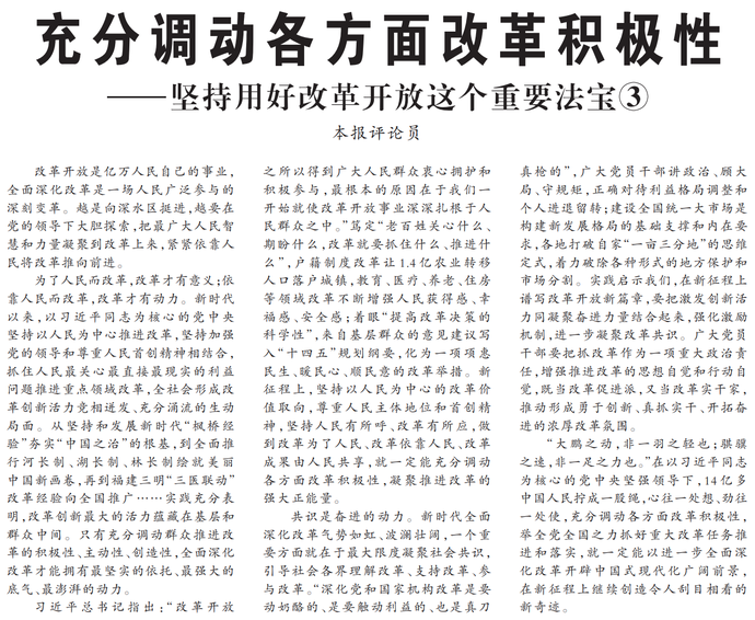 新征程上,紧紧围绕推进中国式现代化进一步全面深化改革,最需依靠的,也是人民。习近平总书记强调,“改革任务越繁重,我们越要依靠人民群众支持和参与,善于通过提出和贯彻正确的改革措施带领人民前进,善于从人民的实践创造和发展要求中完善改革的政策主张。”(今日《人民日报》1版、3版)