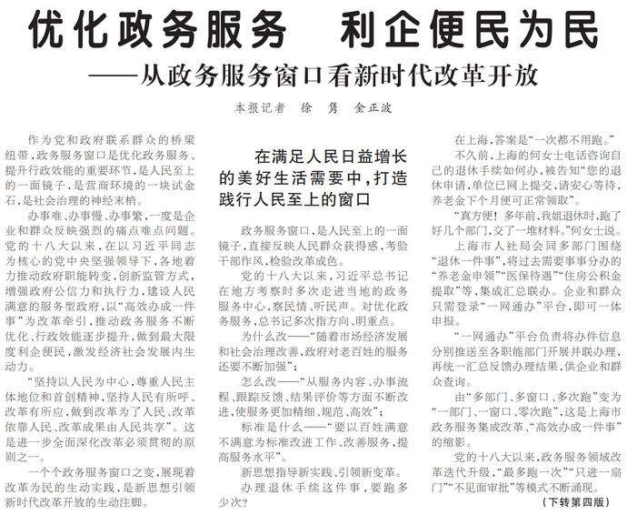 作为党和政府联系群众的桥梁纽带,政务服务窗口是优化政务服务、提升行政效能的重要环节,是人民至上的一面镜子,是营商环境的一块试金石,是社会治理的神经末梢。(今日《人民日报》1版、4版)