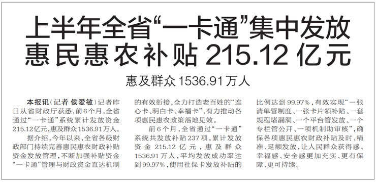 记者昨日从省财政厅获悉,前6个月,全省通过“一卡通”系统累计发放资金215.12亿元,惠及群众1536.91万人。(今日《郑州日报》1版)