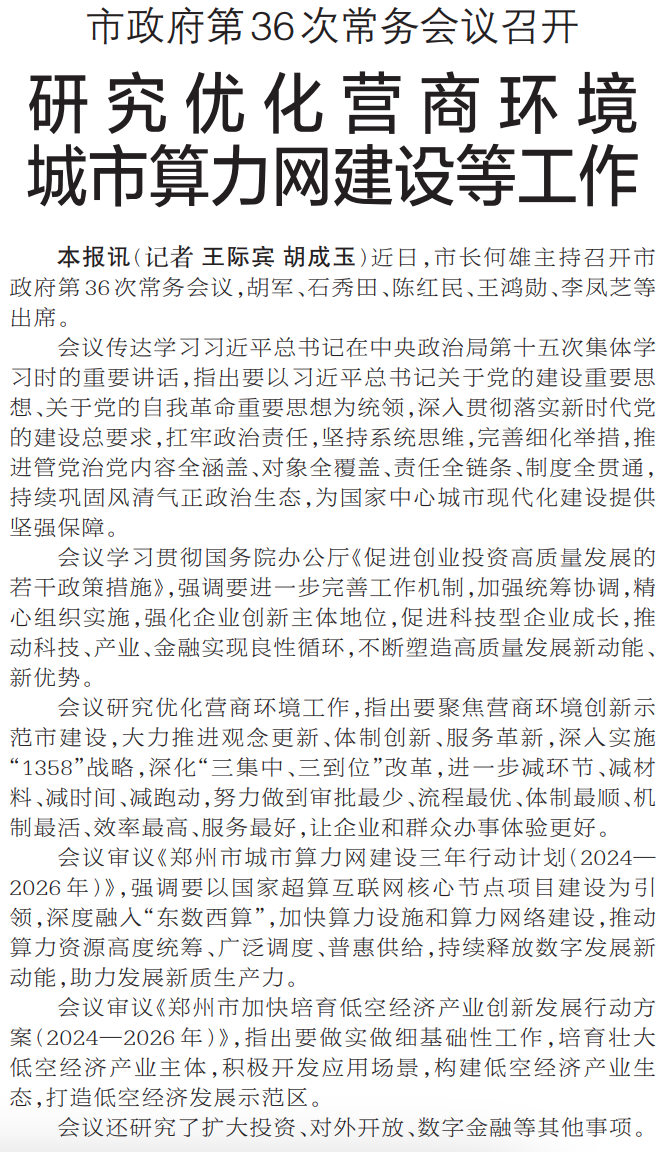 近日,市长何雄主持召开市政府第36次常务会议,胡军、石秀田、陈红民、王鸿勋、李凤芝等出席。(今日《郑州日报》1版)