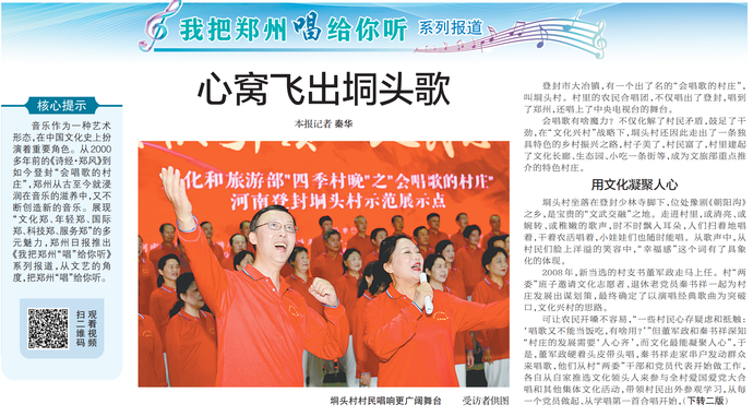 会唱歌有啥魔力?不仅化解了村民矛盾,鼓足了干劲,在“文化兴村”战略下,垌头村还因此走出了一条独具特色的乡村振兴之路,村子美了,村民富了,村里建起了文化长廊、生态园、小吃一条街等,成为文旅部重点推介的特色村庄。(今日《郑州日报》1版、2版)