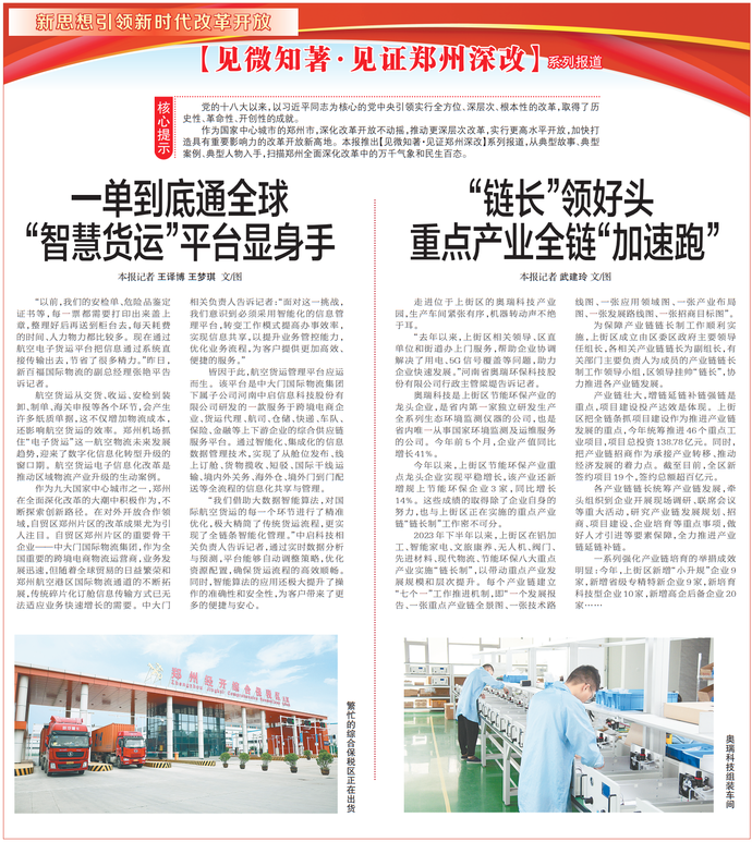 与此同时,圃田车站,一列满载汽车配件、电器等货物的中欧班列鸣笛启程,将驰骋万里,快速、高效地将“中国制造”送往世界各地;从大洋彼岸飞来的航班平稳降落在郑州机场,满载着生鲜果蔬、海鲜等,为人们奉上异国美味。(今日《郑州日报》1版、2版)