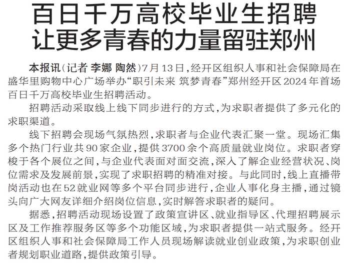 7月13日,经开区组织人事和社会保障局在盛华里购物中心广场举办“职引未来 筑梦青春”郑州经开区2024年首场百日千万高校毕业生招聘活动。(今日《郑州日报》2版)