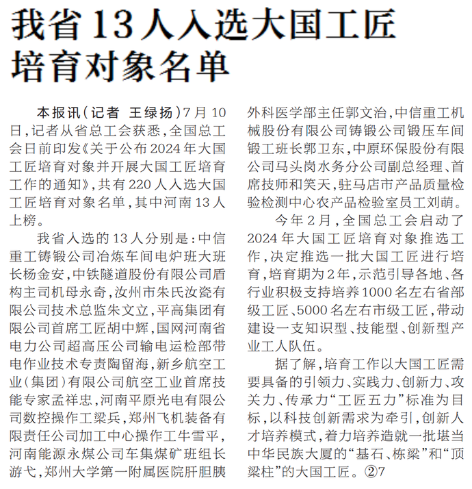 7月10日,记者从省总工会获悉,全国总工会日前印发《关于公布2024年大国工匠培育对象并开展大国工匠培育工作的通知》,共有220人入选大国工匠培育对象名单,其中河南13人上榜。(今日《河南日报》1版)