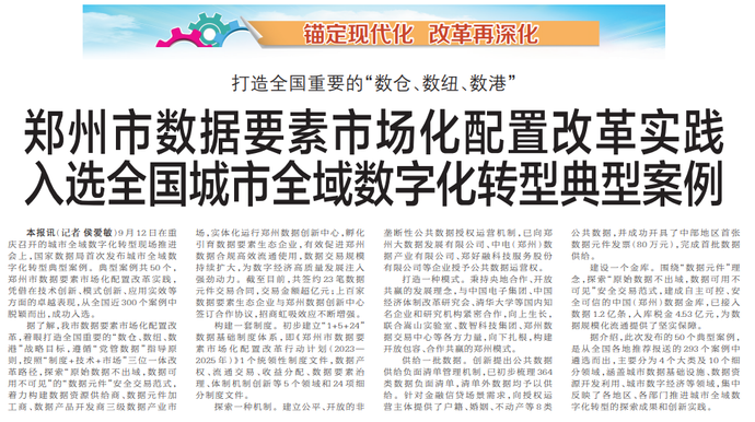 郑州市数据要素市场化配置改革实践入选全国城市全域数字化转型典型案例