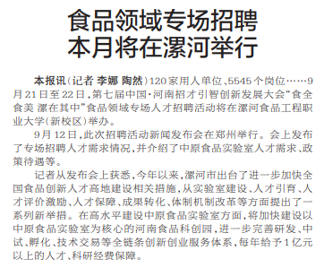 120家用人单位、5545个岗位……9月21日至22日,第七届中国·河南招才引智创新发展大会“食全食美 漯在其中”食品领域专场人才招聘活动将在漯河食品工程职业大学(新校区)举办。(今日《郑州日报》2版)
